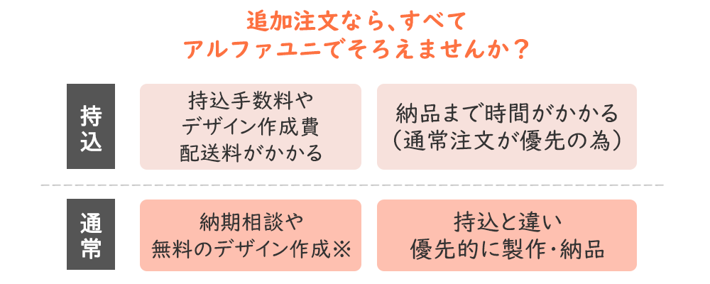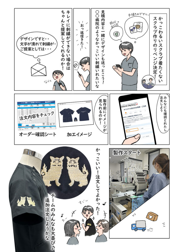 また同じ刺繍を入れてスクラブやウェアを作りたい。持ち込みの追加注文もお受けできますが、弊社で商品を購入いただくとメリットがたくさんあります!持ち込みの手数料がなくなり、税別合計4万円以上ならデザイン作成無料に。持ち込みのご注文よりも優先して製作いたします。納期優先のお客様はご相談ください。