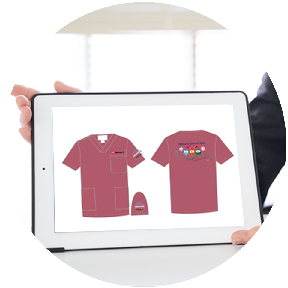 専門のデザインスタッフがお客様のデザインを刺繍で表現できるようデザインを調整して作成いたします。オリジナルデザインでチームスクラブを作りたいけどこのデザインは刺繍で表現できるか不安。希望のスクラブカラーに合う糸カラーを知りたいなどお気軽にご相談ください。