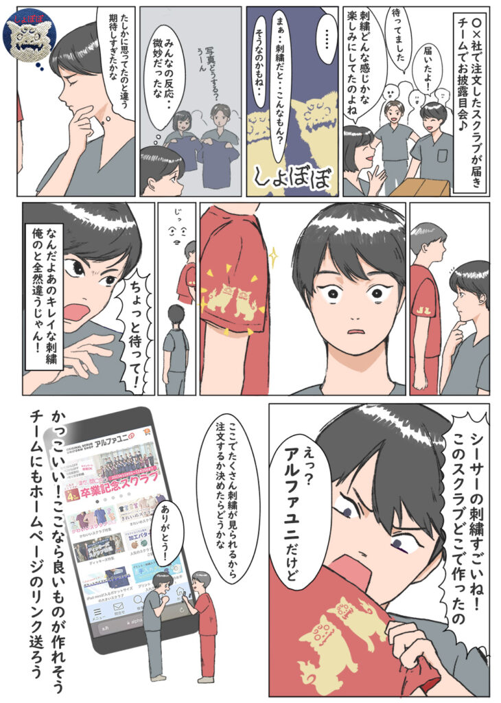 こんな経験ありませんか?楽しみにしていたチームスクラブ。みんなと着て写真撮影したりすてきな思い出にできる・・と思っていたのに。届いた刺繍がひどすぎてショック。カッコいいスクラブが着たかったのにはずかしくて着られない。アルファユニで刺繍を入れてスクラブ作りのリベンジしませんか。