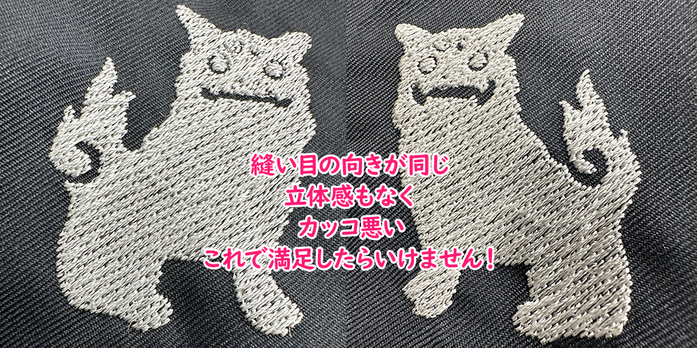下記の刺繍はオートの型で縫ったシーサー(?)です。オートでも出来栄えは何となく良くみえるものですが、斜めにしても立体感が出ません。これでも他社の刺繍より良く見える?