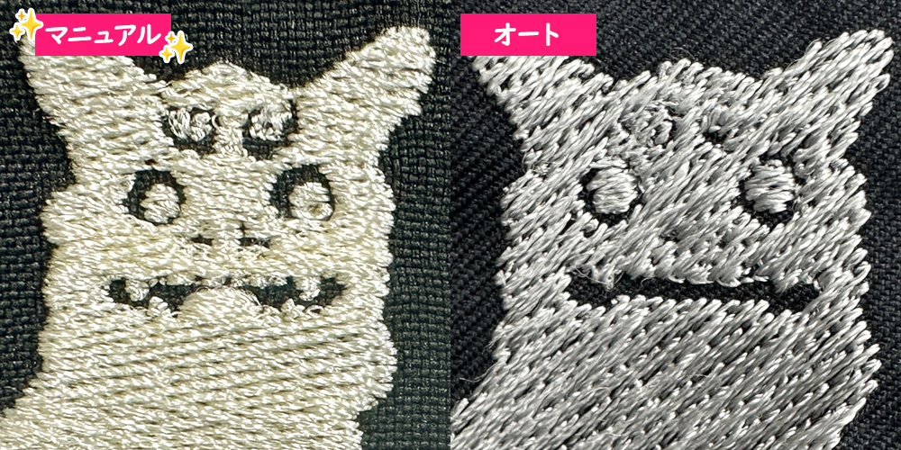 マニュアルのシーサーは眉毛・鼻・歯などもしっかり出ていますが、オートのシーサーは潰れていてぼやけた刺繍になってしまいました。顔がちょっと怖いですね。