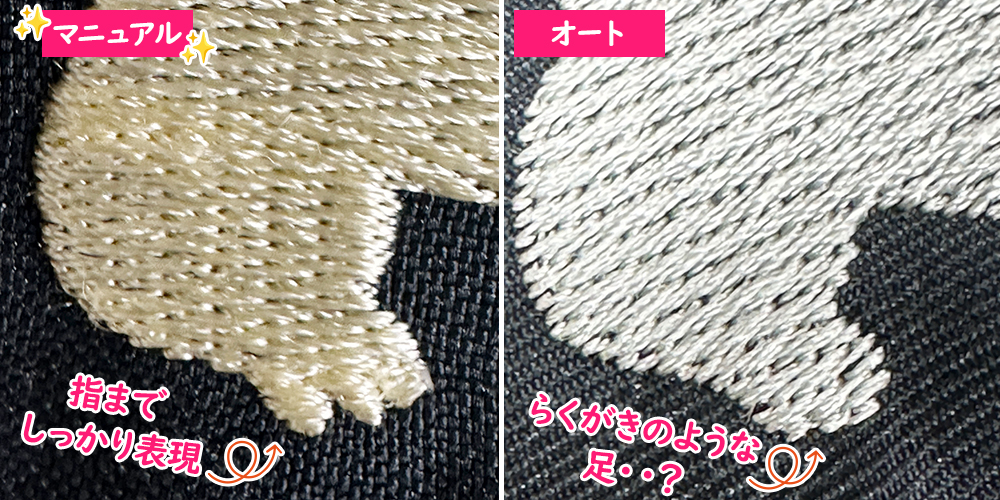 マニュアルのシーサーの指はサテン打ちで立体感をだしています。細かい部分までしっかり表現。オートのシーサーはベタッとしていて立体感がありません。ちょっと雑ならくがきのような仕上がりになっています。