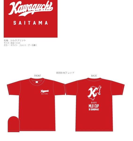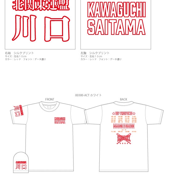 ホワイトのTシャツには、背中にチーム関係者の名前が入ったオリジナルデザイン、左胸と右袖にそれぞれ「川口」の文字をシルクプリントでいれました。レッドのTシャツには、背中に大会が行われる宮城県とKの文字を合わせたデザイン、左胸にチームのロゴをシルクプリントで入れました。