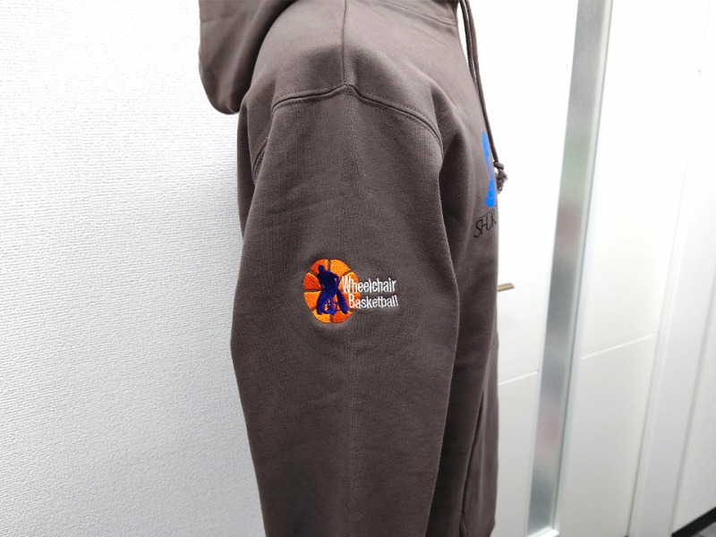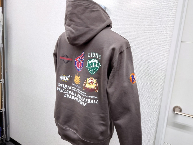 右胸に淑徳大学のロゴマークをシルクプリント、背中に大会に出場した各チームのロゴマークをDTFプリント、右袖に車いすバスケットボールをイメージしたデザイン刺繍を、それぞれ入れさせていただきました。