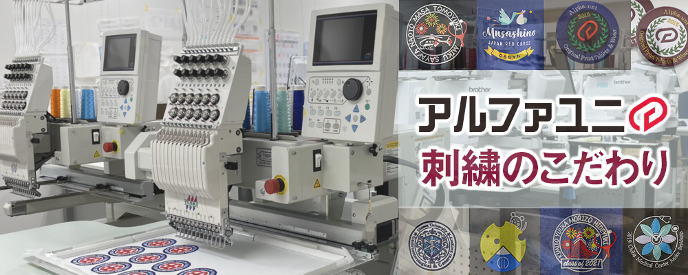 アルファユニではデザインにこだわるオリジナル刺繍はもちろん、ネーム刺繍であってもクオリティの高い刺繍を提供いたします。