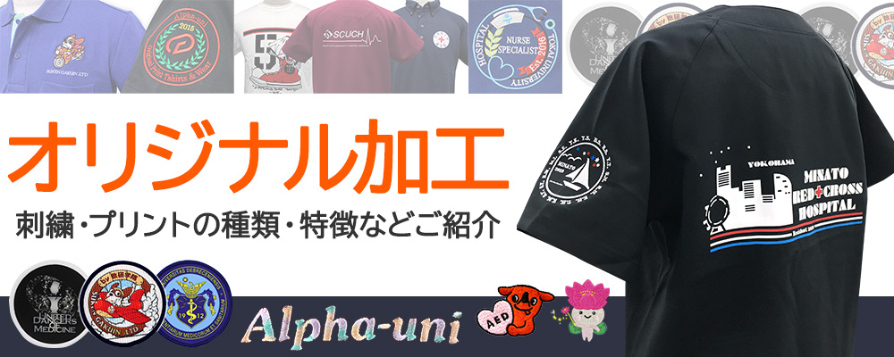 スクラブ白衣に高品質なデザイン刺繍やネーム刺繍、鮮やかなプリントなどを施し、理想の一着を創り上げます。